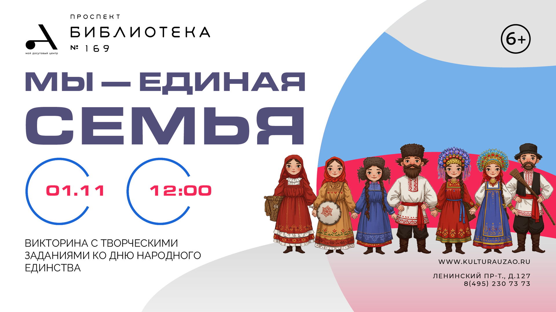 1 ноября в 12:00 в библиотеке 169 "Проспект" состоится викторина для школьников ко Дню народгого единства.